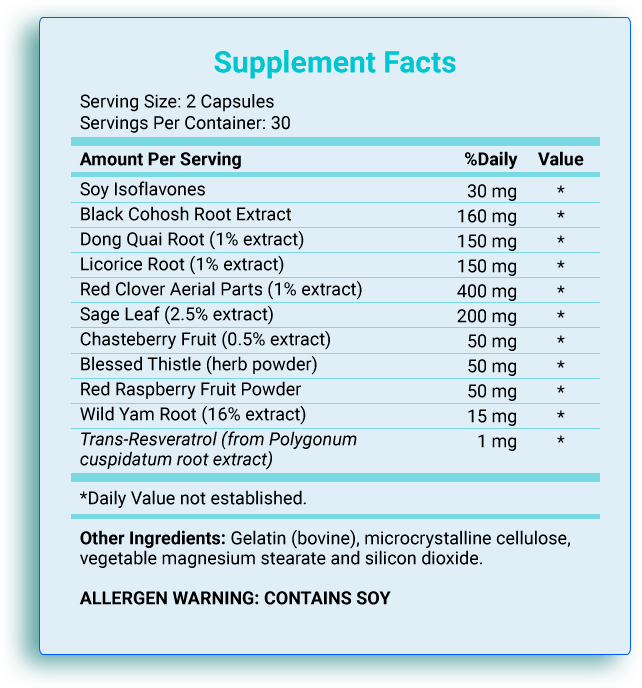 Active ingredients include Isoflavones, Black Cohosh Root, Dong Quai Root, Licorice Root, Sage Leaf, Chasteberry fruit, Red Raspberry Fruit, Wild Yam Root and more.